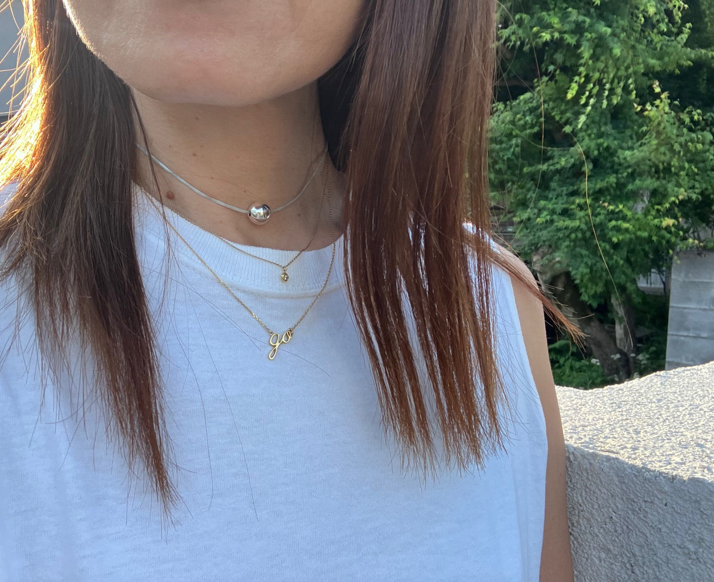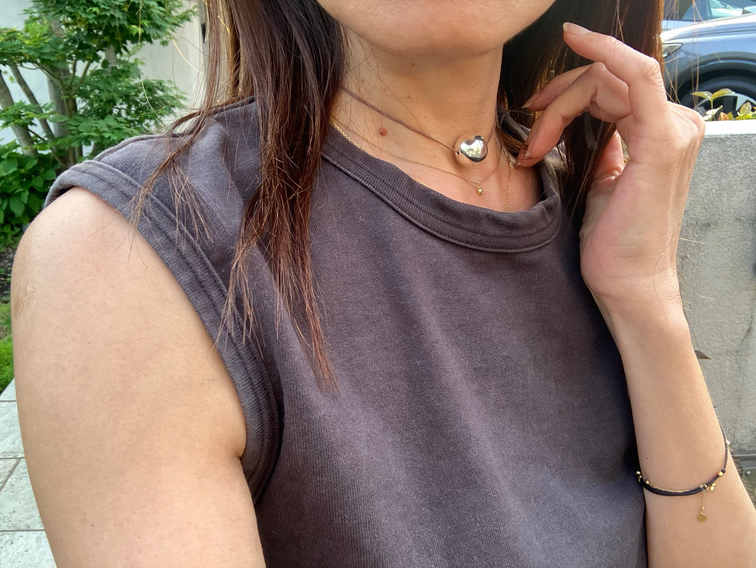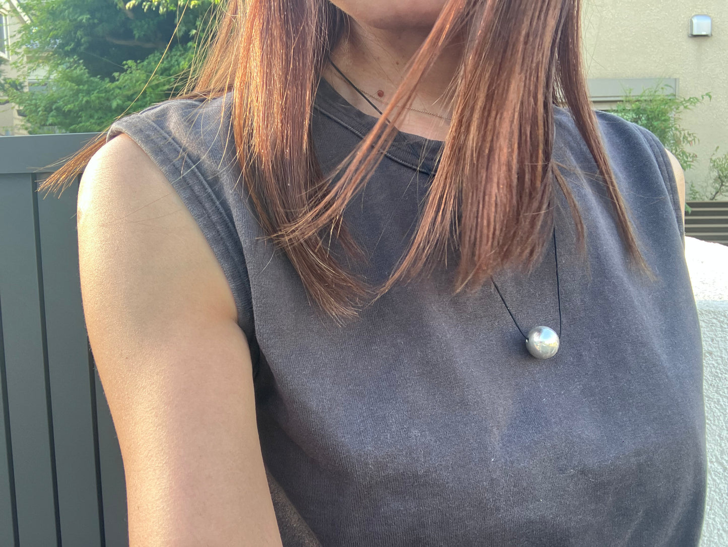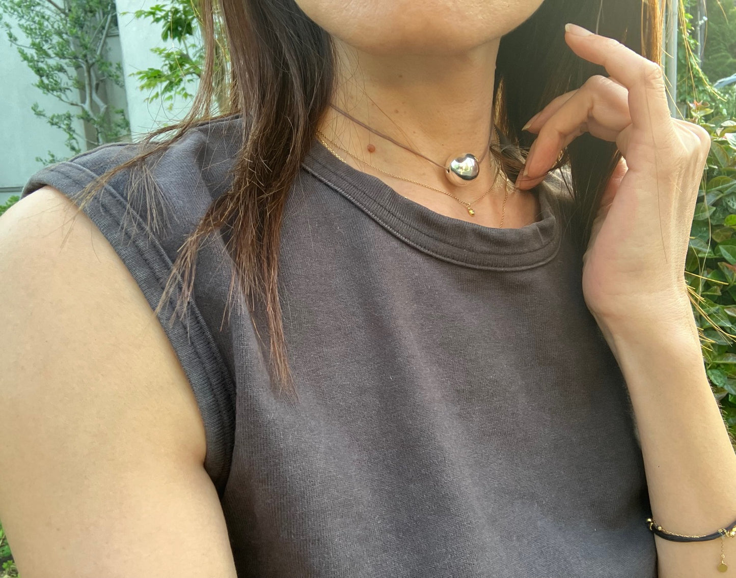 [ How to Use ] Slide the knot ( silver bead ) to adjust the length of the polyester cord by hand and fit it to the preferred location on your neck.