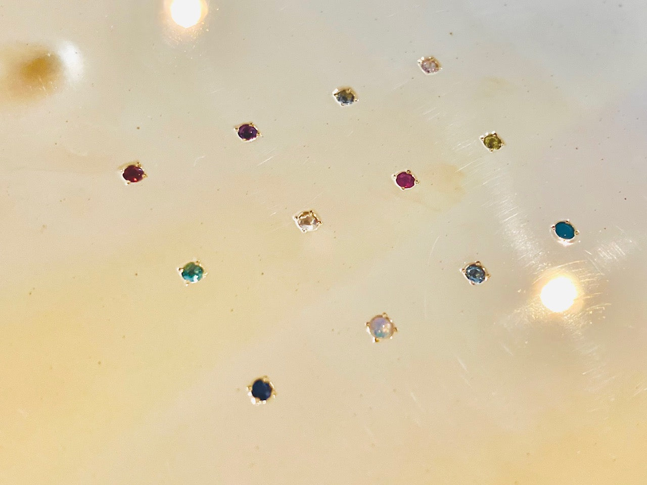 ガーネット、アメジスト、アクアマリン、ダイアモンド、エメラルド、ムーンストーン、ルビー、ペリドット、サファイア、オパール、ブルートパーズ、ターコイズ